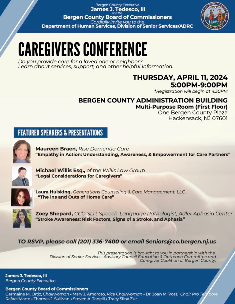 Twice a year, the Bergen County Board of Commissioners and Department of Human Services, Division of Senior Services/ADRC hosts a Caregivers Conference. The goal of this conference is to educate caregivers in the Bergen County, New Jersey area about services, support, and county programs that can help them through their caregiver journey.