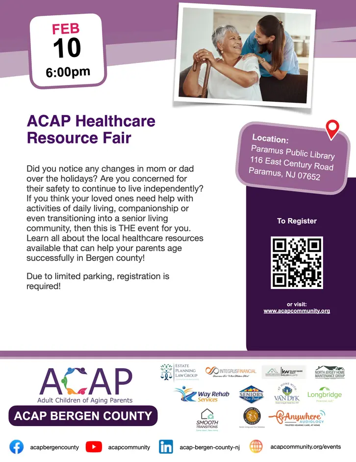 Our next program with ACAP of Bergen County is our “Healthcare Resource Fair” on February 10th at 6:00pm at the Paramus Library. Did you notice any changes in mom or dad over the holidays? Are you concerned for their safety to continue to live independently? If you think your loved ones need help with activities of daily living, companionship or even transitioning into a senior living community, then this is THE event for you. The Generations Staff will have a table and will be answering any questions you have on care management. Registering for this event is required and you can click here to RSVP.