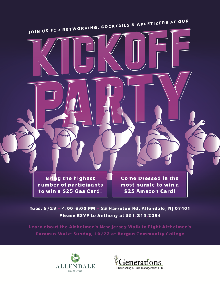 We are proud to co-sponsor this year’s Walk Kick Off Event on 8/29 from 4-6:00pm at Allendale Senior Living. Join us for networking, cocktails and appetizers- all while learning about the important work Alzheimer’s New Jersey is doing for the local New Jersey community- including their Walk to Fight Alzheimer’s at Bergen Community College. You can RSVP to Anthony at 551-315-2094 or Laura at lhuisking@generations-llc.com.
